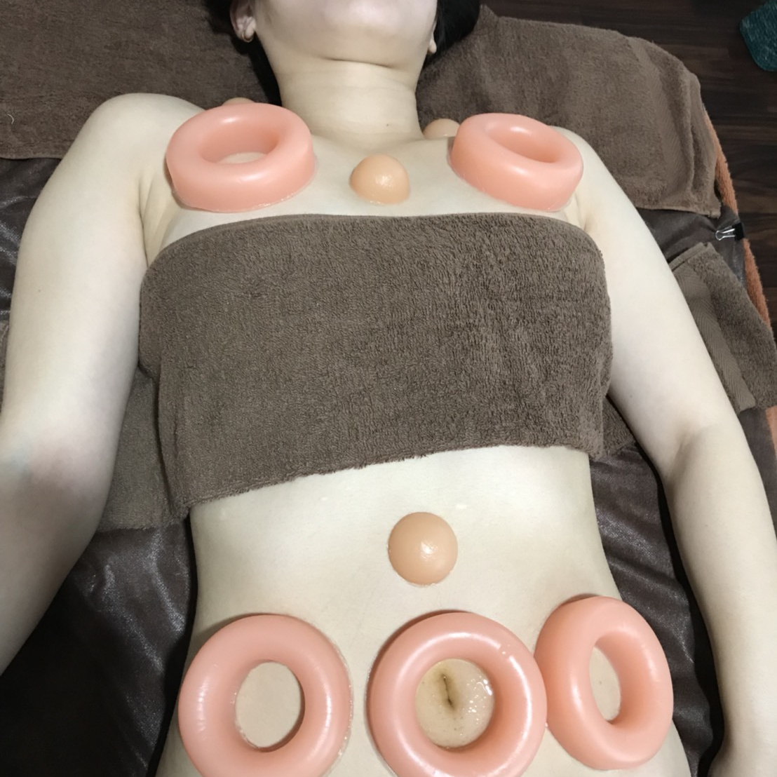 そのほか、首や肩、デコルテやお顔、お腹、脚からふくらはぎ、足裏まで使用でき、温めたオイルとアロマ精油を注いで温熱療法&デトックストリートメントを行うことによって、不眠、腰痛、肩こり、神経疲労、メンタルストレスが驚くほど和らぎます。